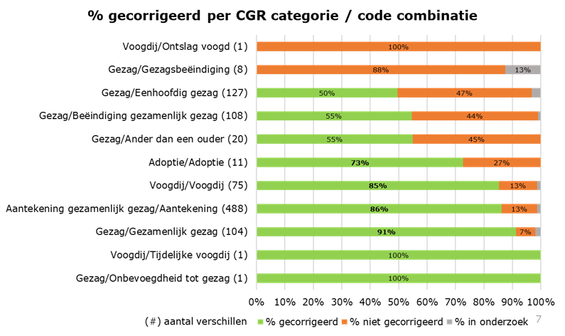 De correctie percentages variëren tussen 50 – 100%, zie grafiek. Met name voor Gezamenlijk gezag, Aantekening gezamenlijk gezag, Voogdij en Adoptie wordt 91% tot 73% van de verschillen gecorrigeerd.
