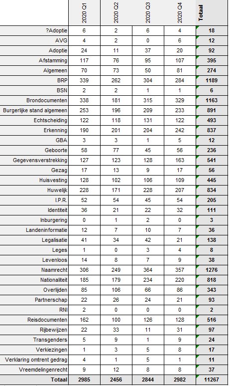 Sinds jaar en dag weten de medewerkers Burgerzaken ons goed te vinden als zij vragen hebben over het brede vakgebied van Burgerzaken. Twaalf adviseurs beantwoorden bij toerbeurt alle vragen; jaarlijks zo’n elfduizend. In de tabel hieronder zie je hoeveel vragen er per vakgebied in 2020 binnenkwamen. Vaak zorgt nieuwe wet- en regelgeving voor een piek in het aantal vragen.
